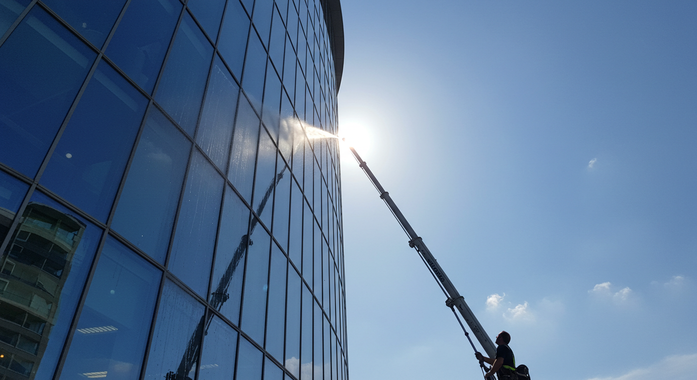 Our Reach and Wash system is the perfect solution for buildings up to six stories high. Using extendable poles and pure water technology, this method allows us to clean windows efficiently and safely from the ground. No ladders, no chemicals — just spot-free, streak-free results every time.